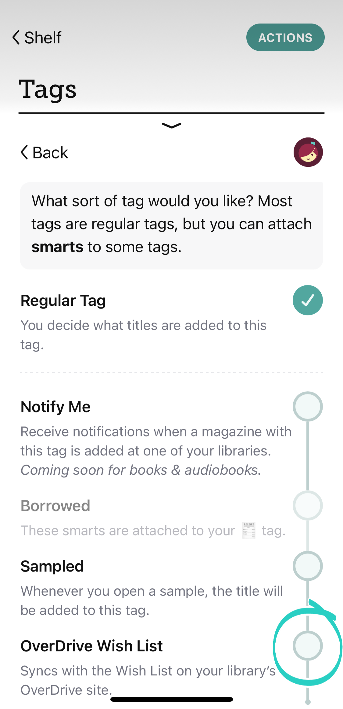 Ef þú hefur nú þegar notað merki í Libby til að fylgjast með óskalistanum þínum geturðu breytt því í snjallmerki fyrir OverDrive óskalista. Annars mælum við með því að þú búir til nýtt merki með snjallmerki fyrir „OverDrive óskalista“: