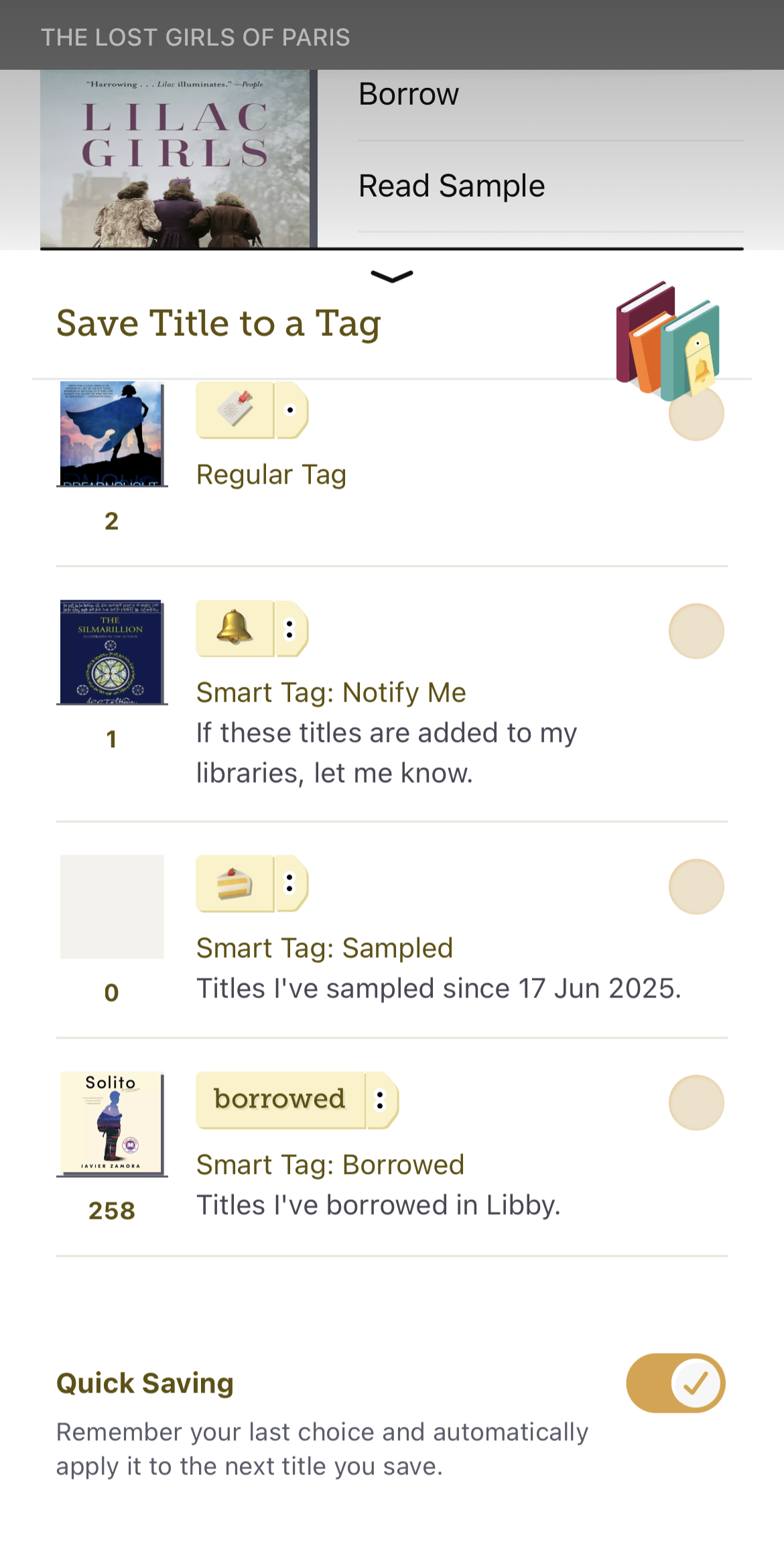 Ábending: Kveiktu á rofanum Flýtivistun (neðst á svæðinu) ef þú vilt vista marga titla undir sama merki. - Renndu niður svæðið til að loka því.