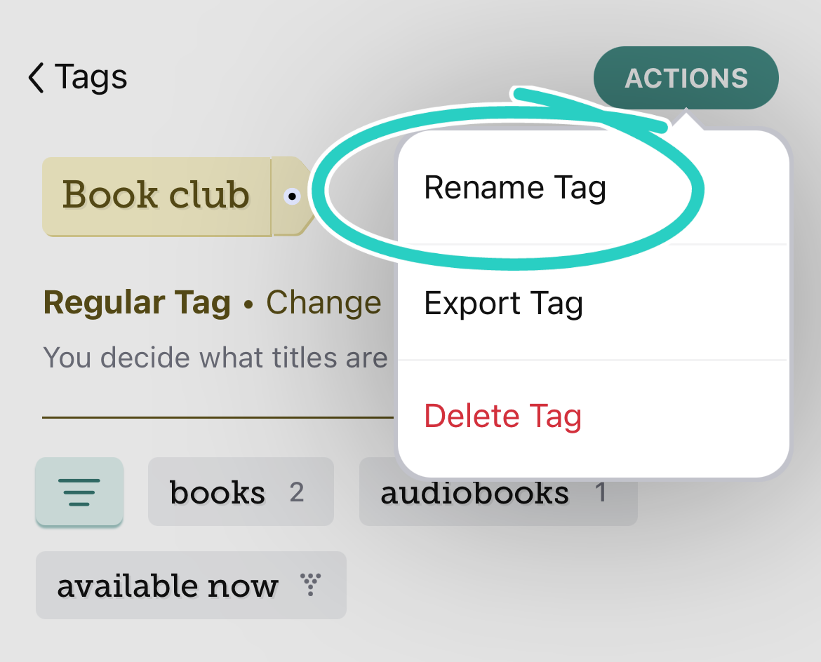 Hjálp með Libby Merki endurnefnd Ýttu á Merki . Veldu merki. Ýttu á Aðgerðir og svo á Fjarlægja merki. Sláðu inn nýtt nafn á merkinu og renndu svæðinu síðan niður til að vista það. Síðast uppfært:október 09 2025