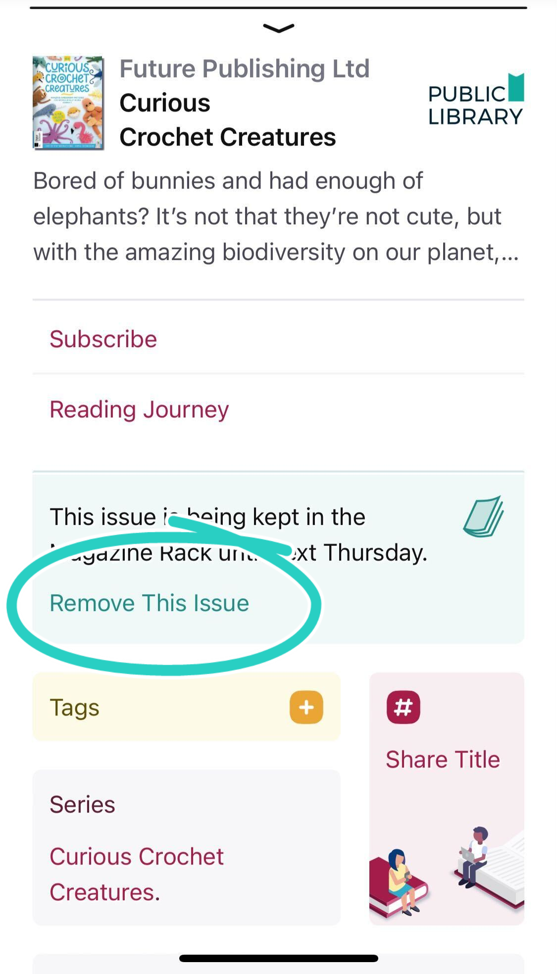 Tímarit sem þú geymir á tímaritastandinum eru sjálfkrafa fjarlægð eftir 7 daga. Ef þú ert búinn að lesa geymt tímarit geturðu fjarlægt það handvirkt úr tímaritastandinum: