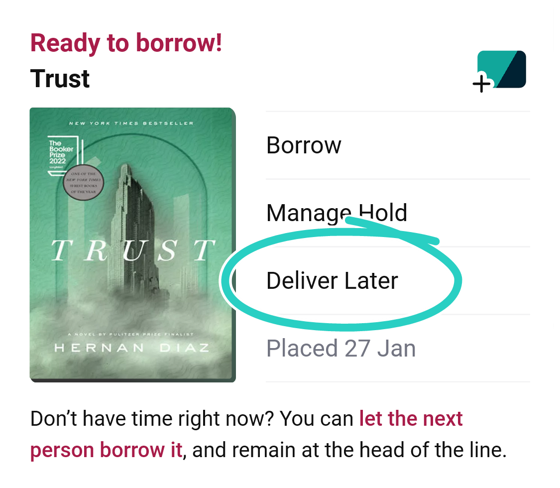 Apabila simpanan tersedia, anda ada 72 jam untuk meminjamnya. Jika anda tidak bersedia untuk meminjamnya, anda boleh mengatur untuk diserahkan kemudian.